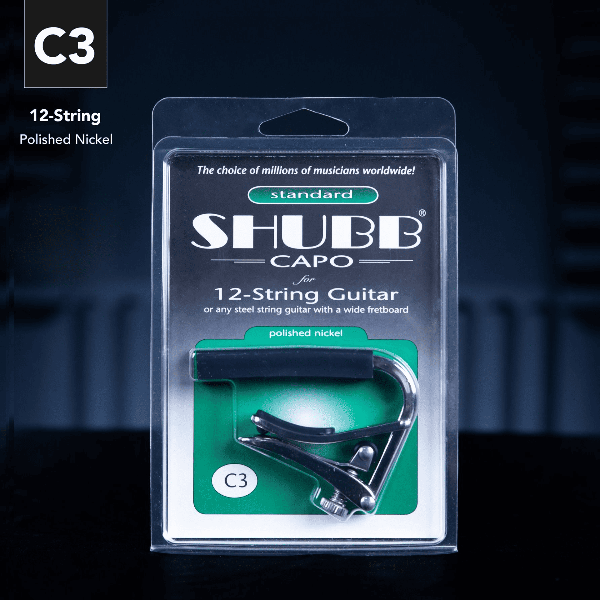 The Shubb Original Acoustic Guitar Capo is manufactured without compromise. Simply holding one in your hand conveys a sense of quality. Snapping it solidly onto a guitar neck, and then removing it, all within about one second, will confirm its reputation for excellence. Its soft, resilient rubber is specially designed to work just like a fingertip, so it doesn't bend the strings over the frets. Its closing action is just like your hand, so it doesn't pull the string off center. As a result, no re-tuning is necessary! Shubb capos are hand-made in the U.S.A from the finest materials available Nickel-plated with dual lever and spring-loaded thumbscrew tension adjustment system All contact points with the guitar are cushioned by, thick, resilient, replaceable pads. This capo for 12-string guitar, or any steel string guitar with a wide fretboard. 2.25" wide, curved for a radiused fretboard.