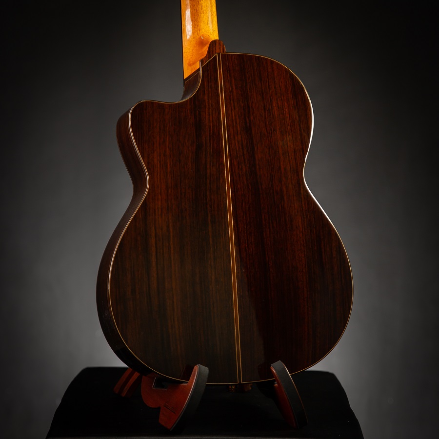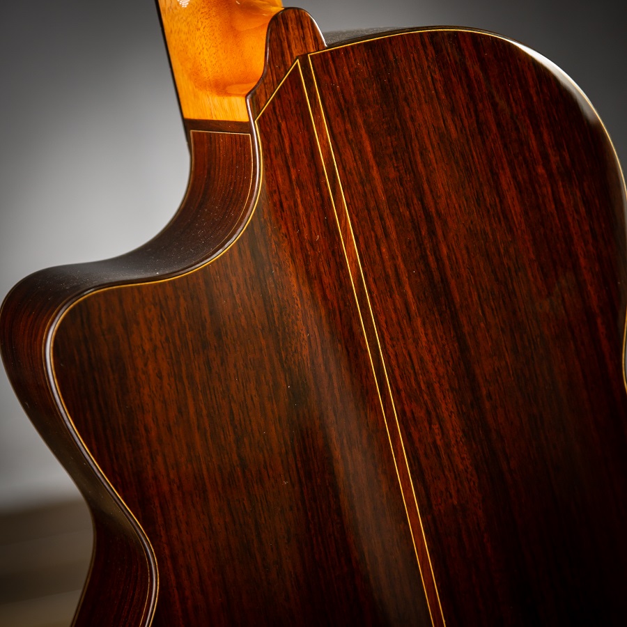 ดีไซน์ตกแต่งสวยงามและโดดเด่นด้วยไม้หลัง Indian Rosewood ที่ลวดลายและสีสรรค์นั้นสวยงามอย่างมาก ประกอบเข้ากับ Solid European Spruce เพื่อโทนเสียงที่ Smooth และ คมชัด