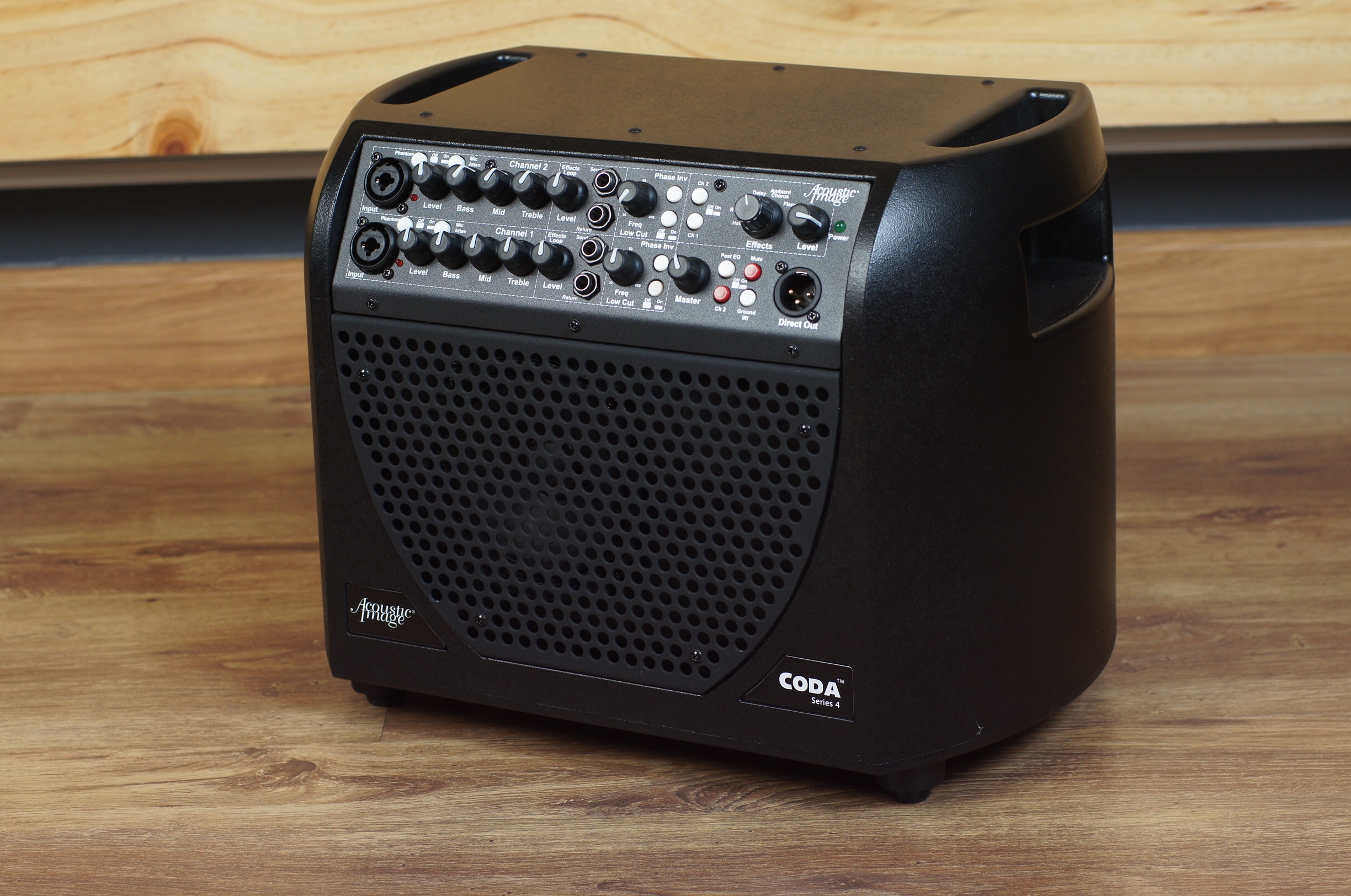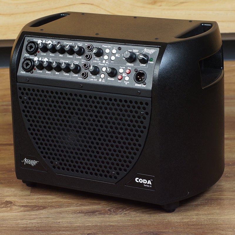 Acoustic Image CODA Series 4 Combo Amplifiers The Series 4 Coda is the newest version of the Acoustic Image small-format combo; it replaces all of the Series III Contra and Coda models, and is available with either one or two identical input channels. All models include built-in digital effects. It includes theCabrio Docking System, which allows you to remove the Clarus head from the combo and use each component separately! AI was on my personal Bass Radar in the late 90's, when I first saw some buzz about this new down-firing bass amp. My first Acoustic Image combo arrived in 1999, and I took it to the NAMM 2000 show in Los Angeles, to demonstrate K&K Sound upright bass pickups in their booth. At one point guitarists Dieter of K&K and borrowed it, to see how his acoustic guitar pickups sounded through it. It took me six hours to wrestle it back from them. The amp was that good. And now, after lots of improvements and updates over the years, it's even better. These combo amps were a real breakthrough when first developed by Dr. Rick Jones, a bass player (check out his CD at right for firm cred) as well as founder, and President of Acoustic Image, and they continue to get better with each generation. The design and performance of the Acoustic Image Coda is quite revolutionary. The lowest bass frequencies are omnidirectional, and we all know our acoustic instruments do not radiate only in one direction — their sound moves about the room. The ten inch down-firing woofer in the Acoustic Image combos spreads that sound around naturally, as our ears might expect. But that's only one of the differences between it and other amps, and there is still plenty of definition, and it's not as annoyingly directional as so many other amps. These combos have a complement of drivers that results in afull range speaker cabinet. In addition to the woofer, you'll find a five inch cone mid/high driver. Plug your MP3 player in and be amazed at the result! Nice tight bass, real, uncolored sound. The other key ingredient in Acoustic Image gear is the electronics. They have been designed to deliver the natural sound of your instrument, no artificial flavorings or colors. Please answer this question... do you want to hear your instrument or the amp?? Me, too. My specifications for an ideal sound is for a pickup/mic and amp to simply make my bass sound bigger. More Power!! (please insert your own Tim Allen Home Improvement TV show grunts) Yes, it can put out up to 600 watts (at 4 ohms). That said, the combos are not rock and roll amps — it's not going to compete with your 4x10! Yes, it can get quite loud, but the wattage is there to ensure smooth, clean response. Bass frequencies take a great deal more energy to produce that high frequencies, and the somewhat percussive nature of upright bass can be very demanding. The wattage is there so the energy is available to cleanly handle those peaks and percussive plucks, rather than that "squashed" sort of attack many bass amps often deliver when they hit the wall. Features Two-way Sealed Speaker System 10" Long-throw Low-frequency Woofer 5" Mid/High-frequency Driver 600-Watt "Digital" Power Amplifier clean power! 600w @4 ohms Internal speaker is 8 ohms One or Two channels for any mix of instruments and microphones using 1/4" or XLR inputs Input and Master Level Controls for each channel Mute Switch Three Band EQ (each channel): Bass Control: Shelving type, ±15 dB @ 60 Hz Mid Control: ±15 dB @ 650 kHz Treble Control: Shelving type, ±15 dB @ 10 kHz Phase Invert Switch (per channel) Switchable Low Cut (High Pass) Filter Notch Filter: -12 dB sweepable from 30 to 700 Hz Notch Control lets you reduce the volume of a single frequency to help fight a feedback or resonance problem High Pass Filter: -12 dB/octave sweepable from 30 to 700 Hz The High Pass filter lets you reduce the response below a frequency of your choice, to fight the mud on boomy stages and in similar situations Built-in Digital Effects 3 Reverbs (Hall, Room, Plate) Delay Ambient Chorus Flange Separate Digital Effects in/out buttons for each channel Cabrio Docking System allows you to separate the amp and speaker components for separate use! Combination Jacks allow the use of a 1/4" or XLR input; input impedances are 1 megohm or 600 ohms based on jack chosen, separately buffered Separate Effects Loops via 1/4" phone jacks with Return Level Control for each channel Balanced XLR Line Output with Ground Lift PRE- or POST-effects switch XLR output Stereo Option: Channel 2 button allows you remove the second channel from this amp, to route it to second amplifier, for stereo use. AC Power On/Off switch with LED Indicator External Speaker Output (Neutrik Speakon), internal speaker is wired directly to the amplifier Detachable AC Input Connector with Built-in Fuse Dual voltage operation (115v/230v, 50/60 Hz) via external switch (comes with USA Cable; to use in other countries, you can source an IEC-C13 AC Cable, also commonly used for computer power supplies.) Physical: Lightweight- less than 20 lbs! with Durable Molded Enclosure 12" H x 15" W x 13" D Molded Carry Handles Dust cover with cable pocket and shoulder strap included FIVE YEAR WARRANTY