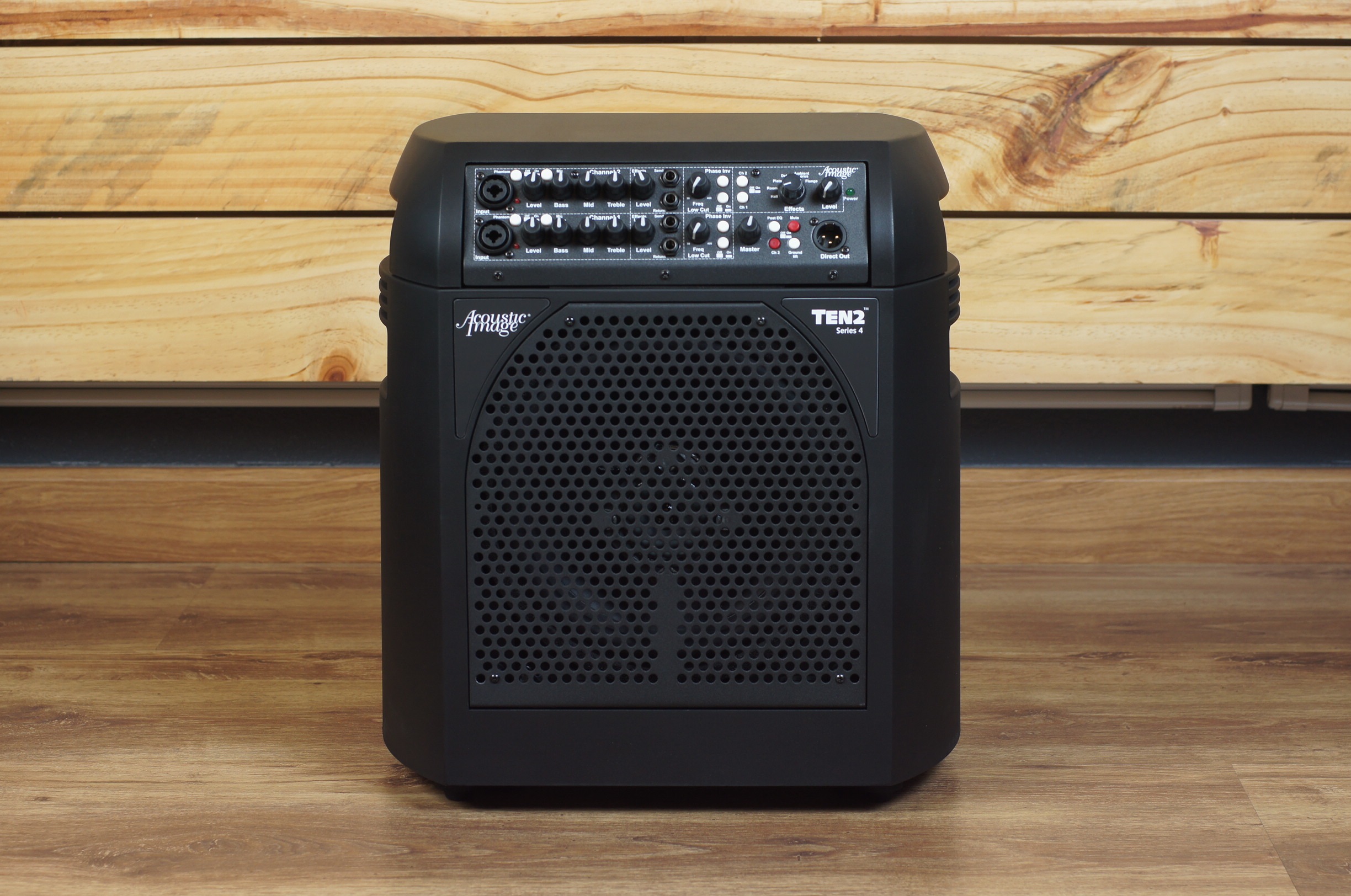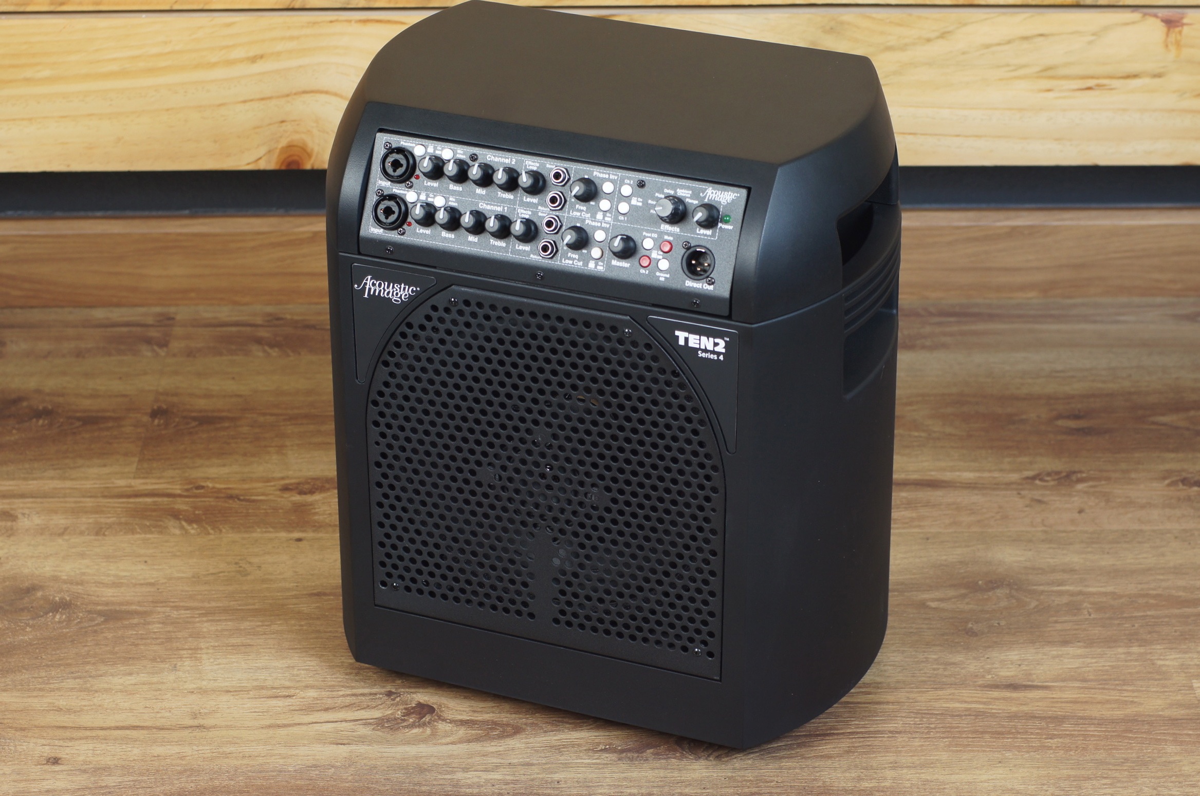 Acoustic Image TEN2 Series 4 Combo Amplifiers The world’s smallest, lightest 2x10 combo Channels: The Ten2 is now available in one-channel and two-channel versions. Power: Both Ten2 amplifiers use the same power amplifier, which provides 650w at 4 ohms. Effects: Both Ten2 models now feature the built-in effects. Sound: They also, thanks to the new power amp design, have "dramatically improved fidelity," with lower distortion and even lower noise - and the Series III models were already highly regarded for their low signal-to-noise ratio! Features Balanced, high fidelity sound, with a more in yer face result than the Contra or Coda Cabrio Docking SystemTM allows you to remove the powerful amplifier head for use with other speaker cabinets Two-way sealed (infinite baffle) speaker system 10 inch downward firing woofer 10 inch front firing woofer 2.5 inch coaxial tweeter (mounted in center position in relation to the front firing woofer) with off/two position attenuation switch Phase correcting crossover Exclusive three position (off-medium-high) Room Coupling ControlTM to help tame boomy acoustics Combination Jacks allow the use of a 1/4 inch or XLR input; input impedances are 1 megohm (1/4 inch) or 600 ohms (XLR) based on jack chosen, separately buffered Phantom power (switchable) on XLR inputs Channel Input and master level controls Three Band EQ (each channel): (see control panel layout below) Bass Control: Shelving type, ±15 dB @ 60 Hz Mid Control: ±15 dB @ 650 kHz Treble Control: Shelving type, ±15 dB @ 10 kHz Effects loop with return level control for each channel Separate Digital Effects in/out buttons and level control for each channel Digital Effects 3 Reverbs (Hall, Room, Plate) Delay Ambient Chorus Flange Separate Digital Effects in/out buttons for each channel Phase Invert Switch (per channel) Switchable Low Cut (High Pass) Filter High Pass Filter: -12 dB/octave sweepable from 30 to 700 Hz The High Pass filter lets you reduce the response below a frequency of your choice, to fight the mud on boomy stages and in similar situations Balanced direct out with ground lift and Pre/Post switch Mute switch Headphone output Two Neutrik Speakon Speaker Jacks - no cable for extension speaker is included (short cable for "combo" operation comes with amplifier). Check our cables selection for options 650-Watt "Digital" Power Amplifier, 450w/8 800w/4ohms 1000w/2ohms (internal speaker is 4 ohms) Switchable dual voltage operation (115/230V) Physical Molded polymer results in a stiff but light enclosure Weight: 32 lbs Size: 17 inches high, approx 15 inches by 13 inches (rounded) Molded Carry Handles Detachable AC Input Connector with Built-in Fuse Dual voltage operation (115v/230v, 50/60 Hz) via external switch (comes with USA Cable; to use in other countries, you can source an IEC-C13 AC Cable, also commonly used for computer power supplies.) Comes with fitted slip cover with cord storage pocket and shoulder strap FIVE YEAR WARRANTY
