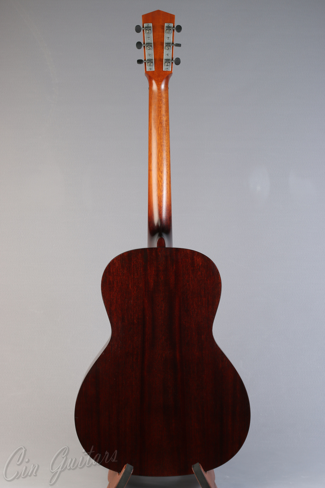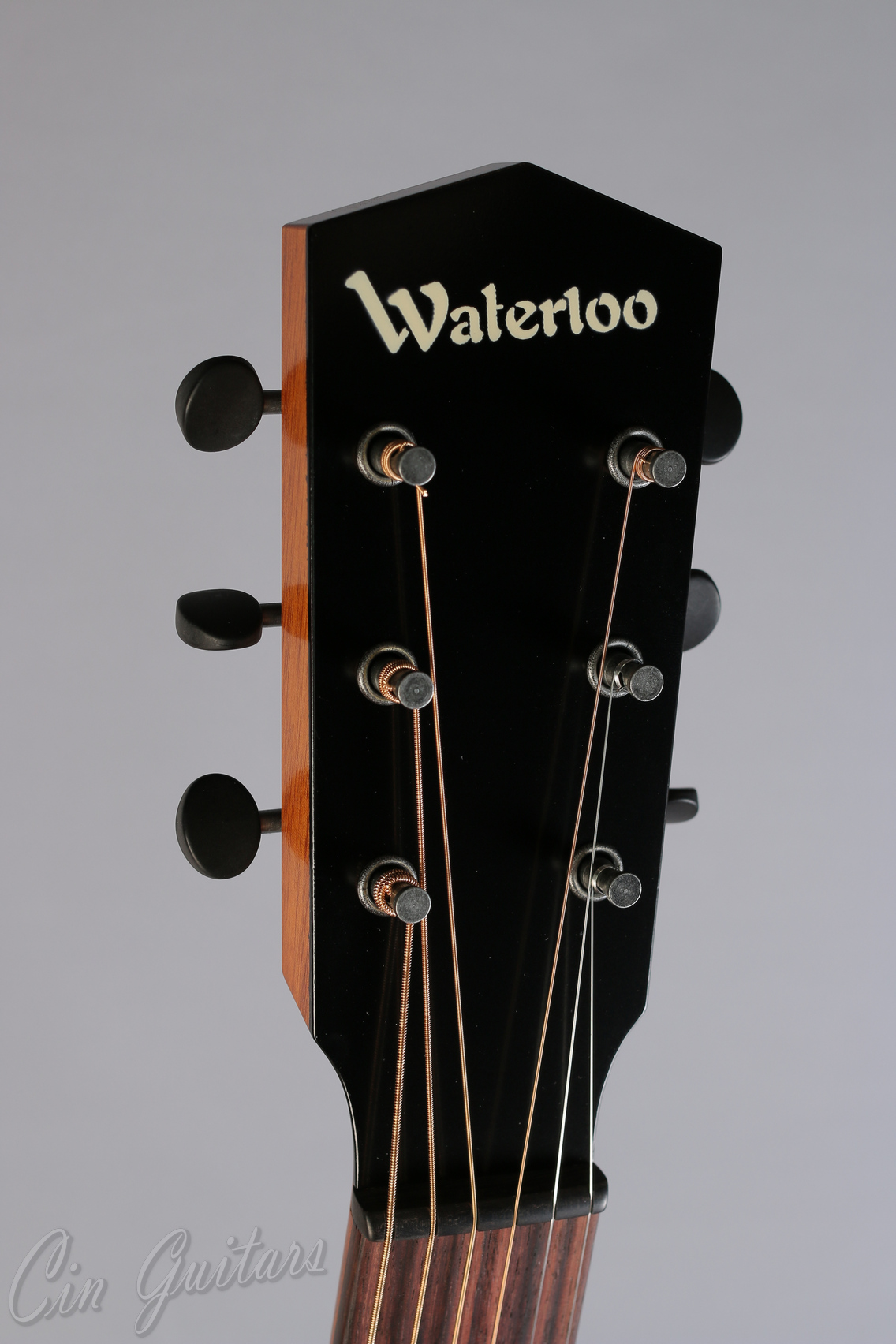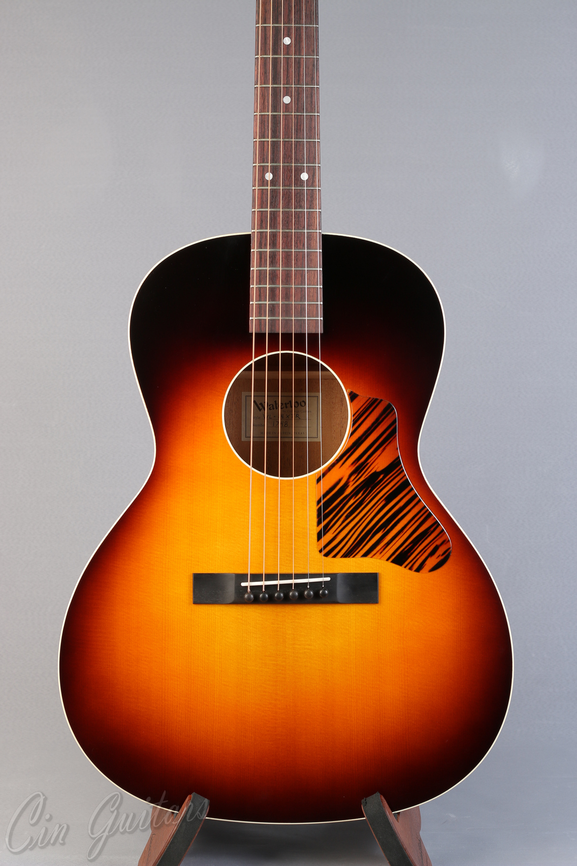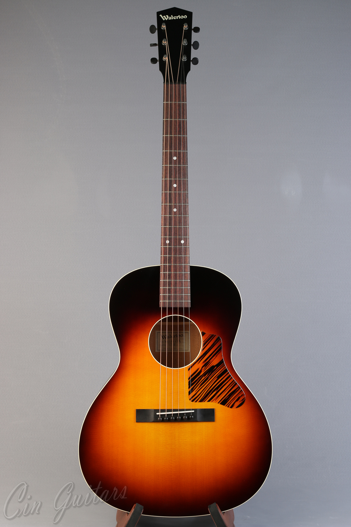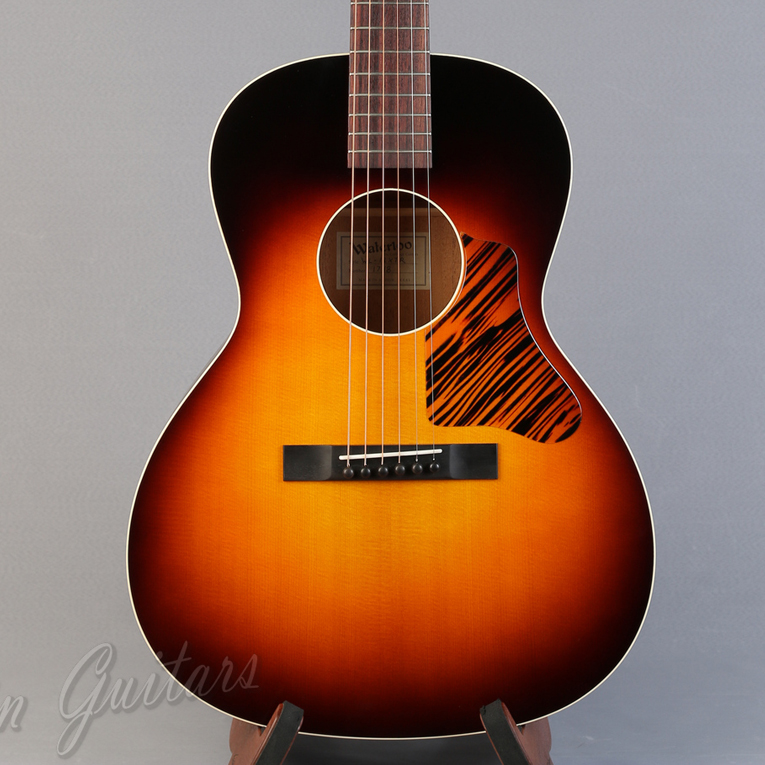 Top: Solid spruce Back/Sides: Solid mahogany Color: Vintage-style Sunburst or Jet Black Binding: Ivoroid bound top and soundhole Bridge Pins: Ebony Tuners: Golden Age Restoration Bracing: Choice of ladder (L) or x-bracing (X) Pickguard: Tigerstripe celluloid Body Finish: Semi-gloss nitrocellulose lacquer finish Neck: Solid mahogany Fingerboard: Indian rosewood Bridge: Ebony with 2 3/8" spacing Nut: 1 3/4" ebony nut Saddle: Bone drop-in Neck Support: Choice of carbon fiber T-bar or adjustable truss rod Fingerboard Inlays: 6mm acrylic dots Neck Profile: Prominent "V" shape Logo: Stenciled Waterloo Scale Length: 24 7/8" Fret Wire: Medium 18% nickel-silver